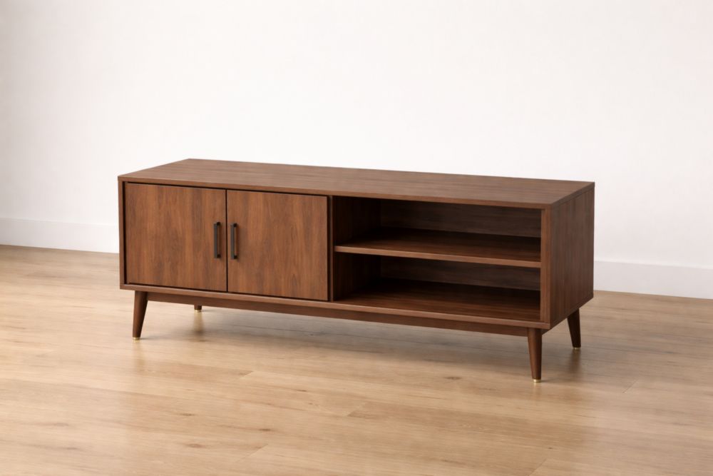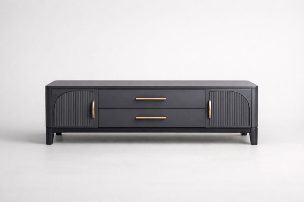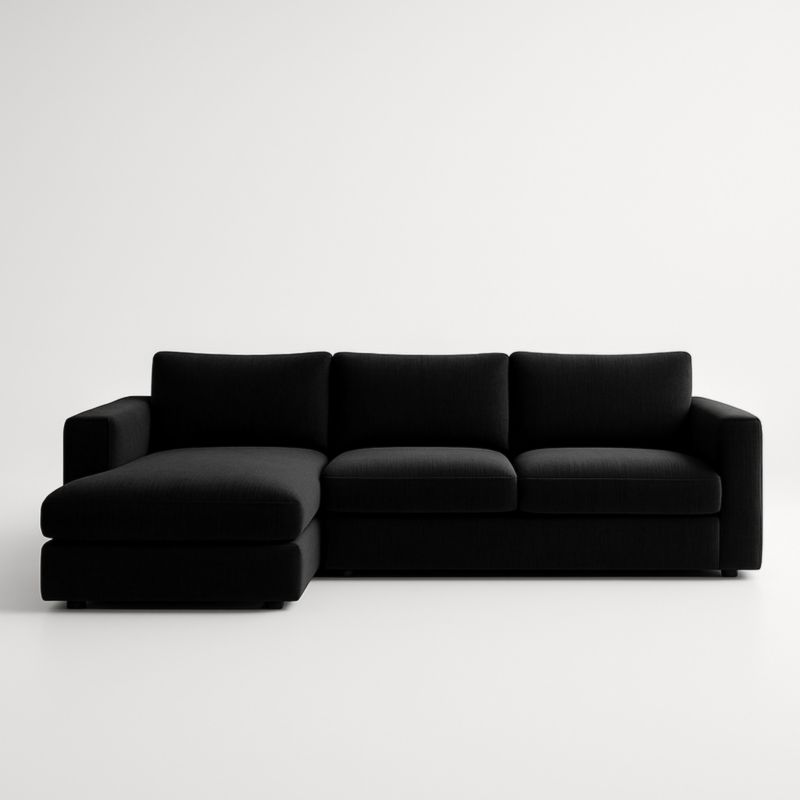 Canapé d’angle avec revêtement en tissu noir et rembourrage en mousse. Structure solide avec assise et dossier rembourrés. Conception simple avec accoudoirs.